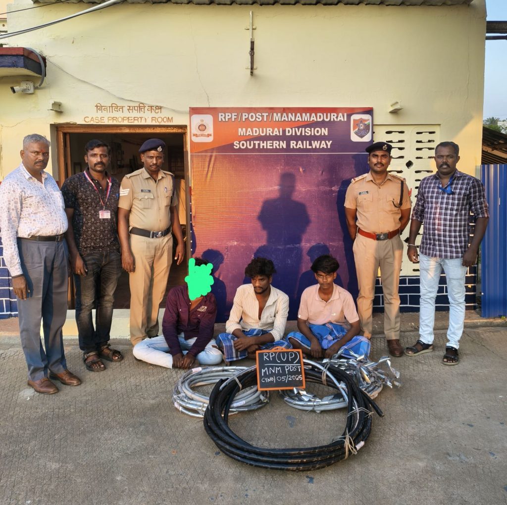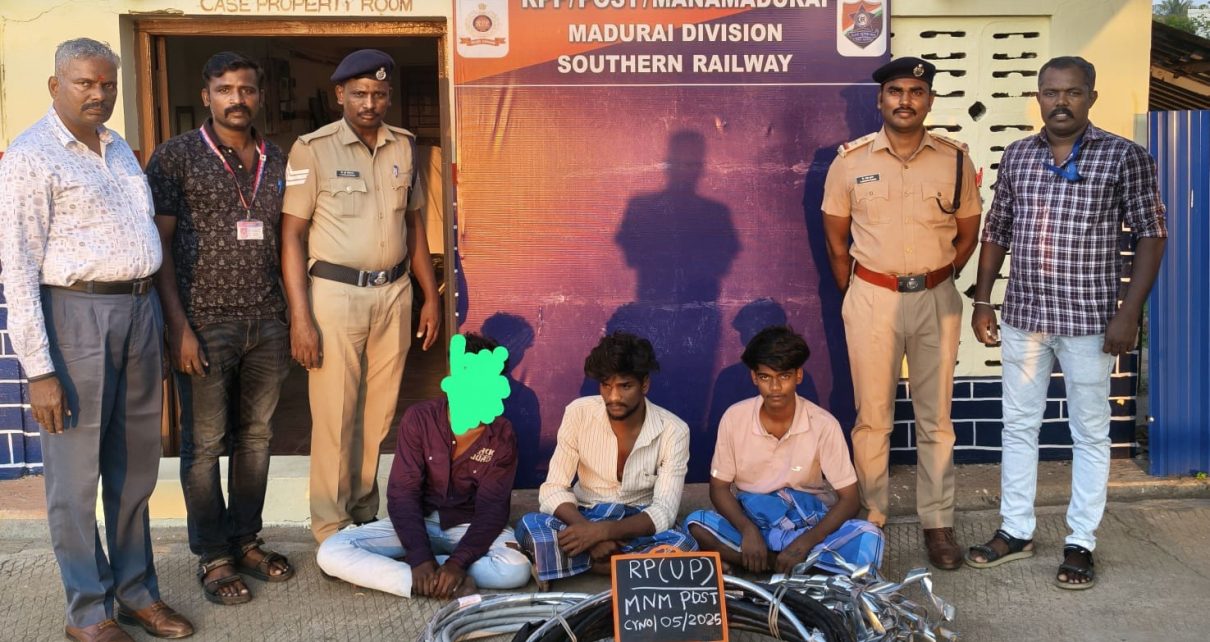 கடந்த 02.11.25 ம் தேதி மானாமதுரை ரயில் நிலையத்திற்கு எதிரில் உள்ள ரயில்வே கிட்டங்கியில் செம்பு வயர்கள் மற்றும் ரயில்வேக்கு சொந்தமான பொருட்களை சிலர் திருடிக்கொண்டிருக்கும் போது அவர்களை கையும் களவுமாக ரயில்வே பாதுகாப்பு படையினர் பிடித்தனர். அவர்களை விசாரணை செய்த போது அவர்கள் மானா மதுரை சேர்ந்த கூடலிங்கம் மகன் நவநீதகிருஷ்ணன் வயது 22, மானாமதுரை சேர்ந்த உடையார் மகன் உதயராகவன் வயது 19, மற்றும் மானாமதுரை சேர்ந்த கணேசன் மகன் தனுஷ் வயது 17 என தெரிய வந்தது இவர்கள் 10,796,50/ ரூபாய் மதிப்புள்ள 43.17 மீட்டர் நீளமுள்ள செம்பு கேபிள் வயர்களை திருடிக் கொண்டிருக்கும் பொழுது அந்த வழியே ரோந்து பணியில் ஈடுபட்டிருந்த ரயில்வே பாதுகாப்பு படை சப் இன்ஸ்பெக்டர் சம்பத்குமார், வேல்முருகன் ஜெயக்குமார் கான்ஸ்டபிள் குற்ற நுண்ணறிவுப் பிரிவு திரு கோட்டைச்சாமி காவலர் திரு விஜய் ராஜா காவலர் சிஐபி மற்றும் ஆர் பி எப் காவலர் விக்னேஸ்வரன் ஆகியோர் அவர்களை சுற்றி வளைத்து பிடித்து கைது செய்தனர்.