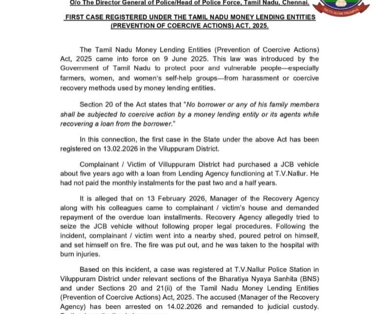 கடன் கொடுக்கும் தனியார் நிதி நிறுவனங்கள் சட்டப்படியான நடவடிக்கைகளை கடைப்பிடிக்க வேண்டும். நிறுவனங்கள் கடனை வசூல் செய்யும் பைனான்ஸ், சிறு வங்கிகள் அடியாட்கள் வைத்து கடன் வசூல் செய்யும் போது கடன் வாங்கியவர்களின் வீட்டிற்கு சென்று மிரட்டுவது, ஆபாசமாக பேசுவது போன்ற செயல்களில் ஈடுபட்டு வருவதை தடுக்க தமிழக அரசு 2025ல் சட்டம் கொண்டுவந்தது. இந்த சட்டத்தின் கீழ் முதன்முதலில் விழுப்புரம் மாவட்டத்தில் F I R பதிவு செய்யப்பட்டுள்ளது. நிதி நிறுவனங்கள் கடன் வசூல் செய்ய சட்டப்படியான வழி முறையை பின்பற்றாத போது, இந்த சட்டத்தின் கீழ் நடவடிக்கை எடுக்கப்படும் என காவல்துறை அறிவித்துள்ளது.