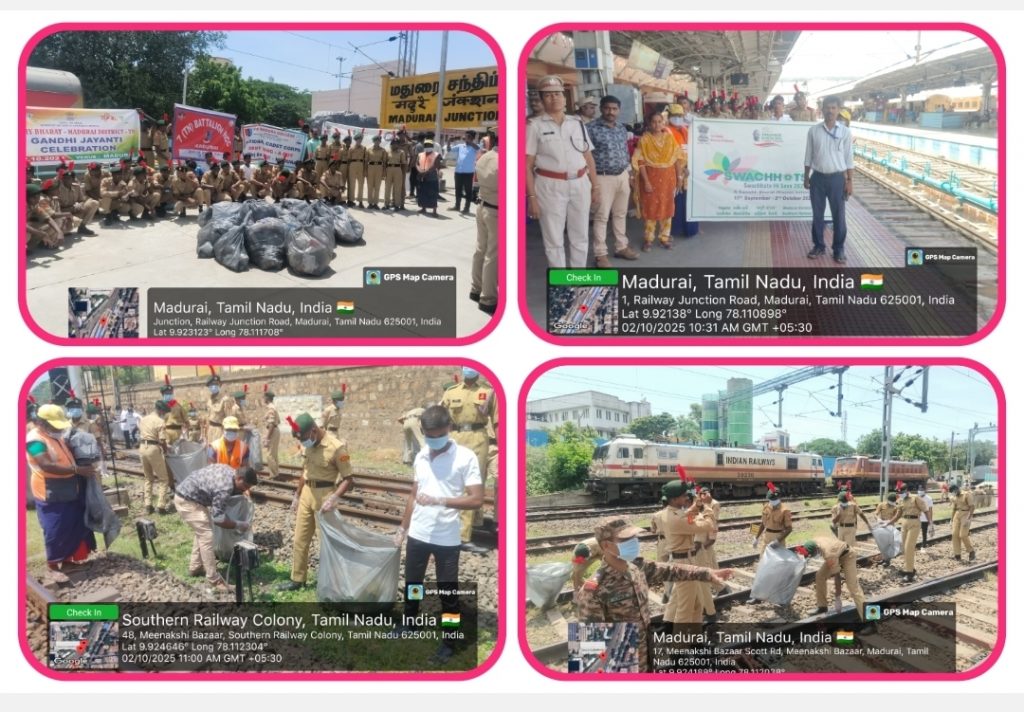 02-10-2025 அன்று மதுரை தெற்கு ரயில் நிலைய சுதாகாரத் துரையின் தலைமையில் காந்தி ஜெயந்தியை முன்னிட்டு நடைபெற்ற தூய்மை பணியில் மதுரை கல்லூரி, தியாகராஜர் கல்லூரி, தமிழ்நாடு அரசு பாலிடெக்னிக் கல்லூரி, லதா மாதவன் பொறியியல் கல்லூரிகளை சேர்ந்த 80 NCC மாணவர்கள் தூய்மை பணியில் ஈடுபட்டு ரயில் தண்டவாளங்களை தூய்மைப்படுத்தினர். தூய்மை பற்றிய அவசியம் மற்றும் விழிப்புணர்வை ஊர்வலம் மூலமாக பொதுமக்களுக்கு மாணவர்கள் அறிவுறுத்தினர். நிகழ்ச்சிகளுக்கான ஏற்பாட்டை NCC அதிகாரிகள் லெப்டினென்ட் கார்த்திகேயன் மற்றும் லெப்டினென்ட் ஞானப்பிரகாசம் ஏற்பாடு செய்தனர். 7 வது NCC பட்டாலியன் ராணுவ அதிகாரிகள் சுபேதார் பால் மற்றும் ஹவில்தார் பசுபதி உடனிருந்தனர்.